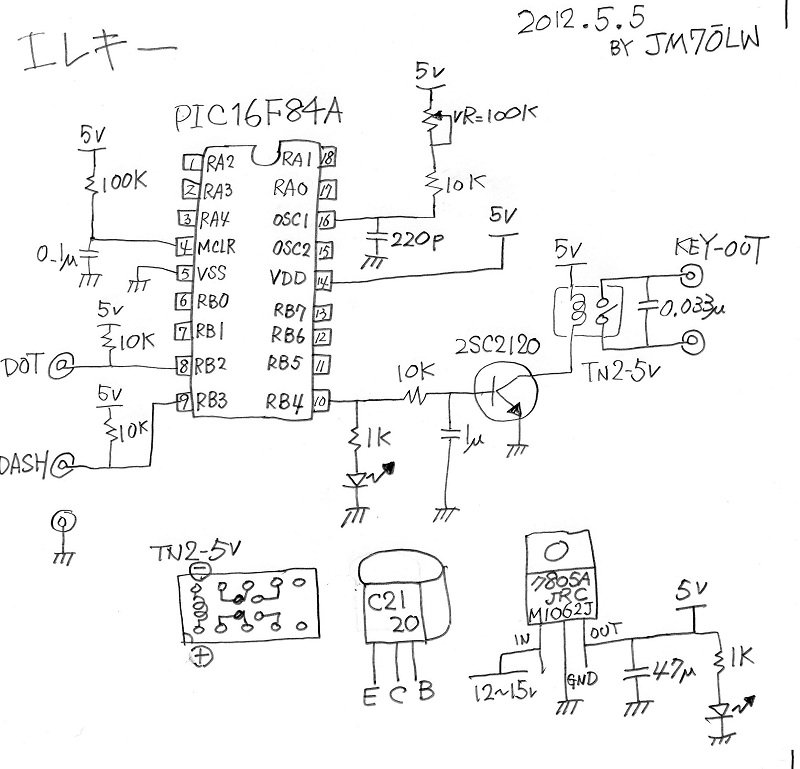 home brew electric keyer with PIC16F84A. used only for FT101ES Program sourece file see you on the bands end
