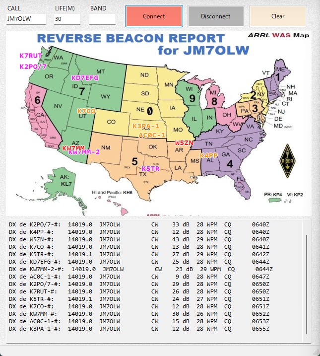 Reverse Beacon spotters are shown on the map who hearing JM7OLW during on air.